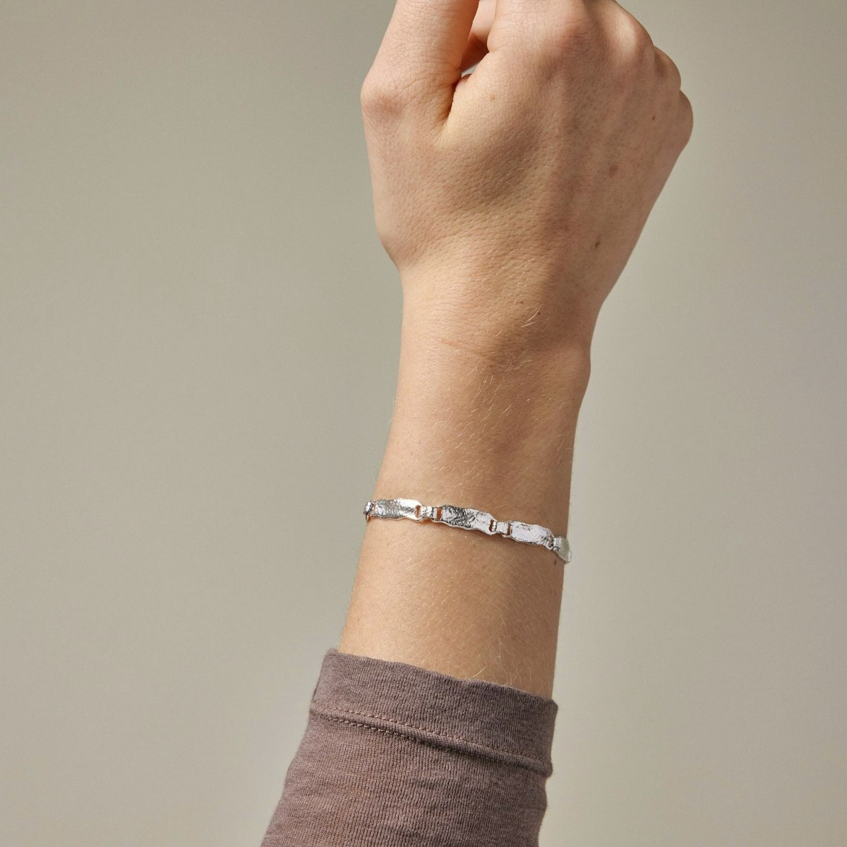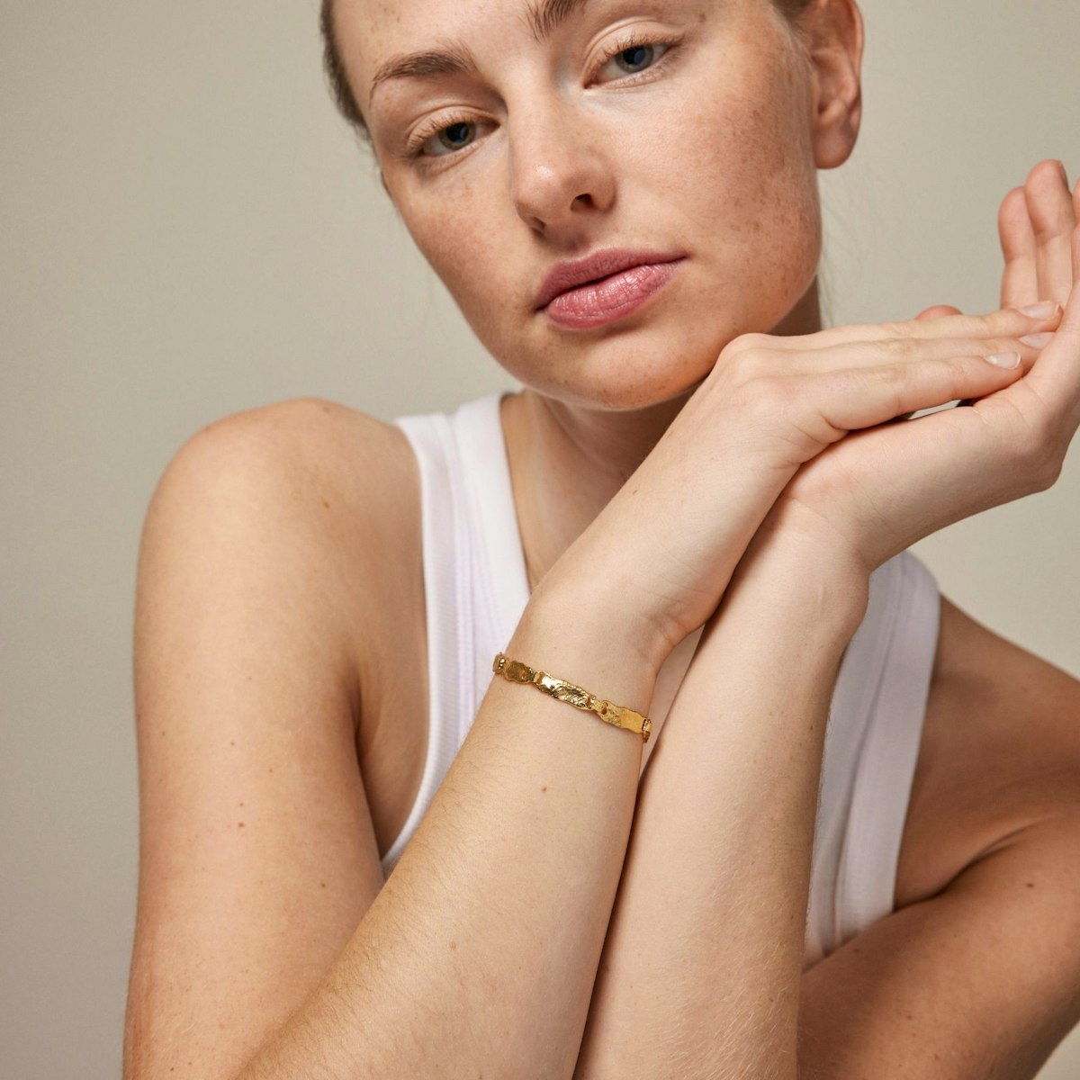 Smykkebeskrivelse: Melvina-armbåndet i 925 sterlingsølv er et af de mere eksklusive armbånd fra ENAMEL Copenhagen, men det er uden tvivl hele investeringen værd og mere til. De rå og kraftige sølvled lægger sig smukt om håndleddet og skaber den samme overdimensionerede effekt som en manchet, men med dynamik og bevægelighed. Armbåndet fås også i guldbelagt version.
