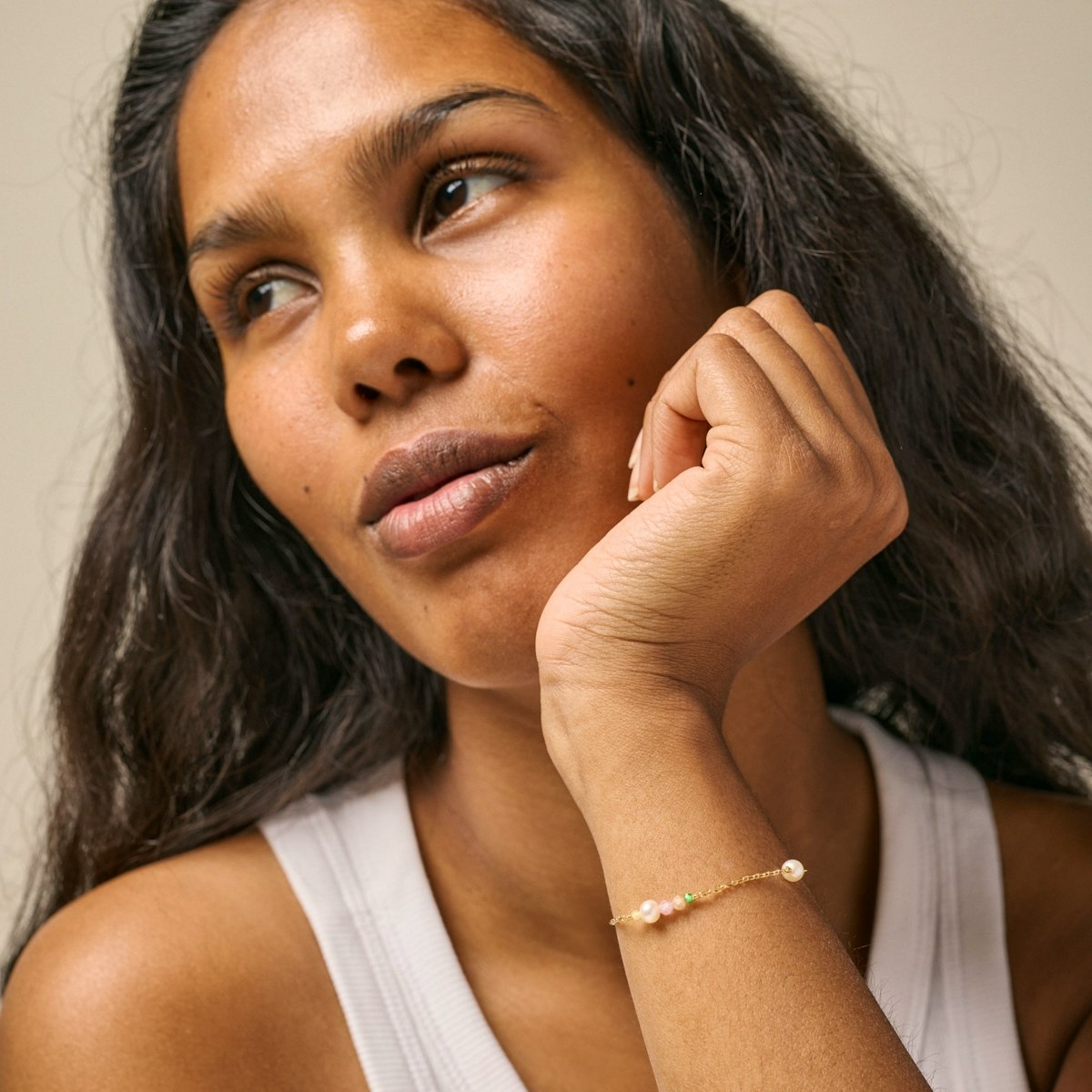 Armbåndet er kendetegnet ved sin fyldige, livlige og søde udstråling. Dette armbånd er kunstfærdigt sammensat af en blanding af smukke sten og perler, som tilsammen skaber en fin balance mellem kant og feminin charme. Farverne på Sofia armbåndet er nøje udvalgt for at komplementere en sommerbrun kulør, hvilket gør det til det perfekte tilbehør til solrige dage og varme aftener. Det livlige farvespil fremhæver solens glød på din hud og tilføjer en ekstra dimension til din sommerstil.