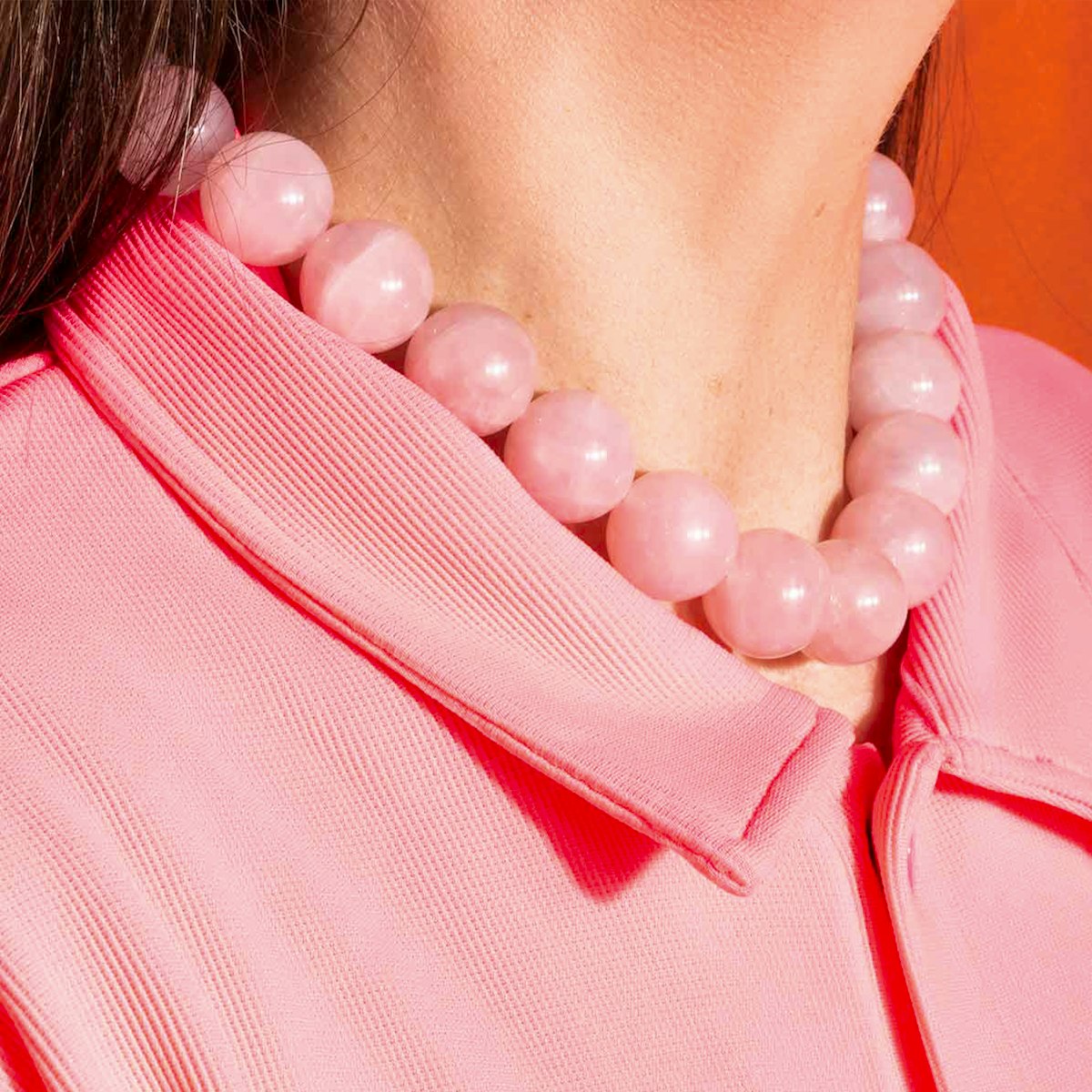 A pearl necklace out of the ordinary! Arcade Fortune is an oversized interpretation of the classic pearl necklace - this one is composed of 19.5 cm ball-cut rose quartz. As the chain is made of natural semi-precious stone, it has a good weight.