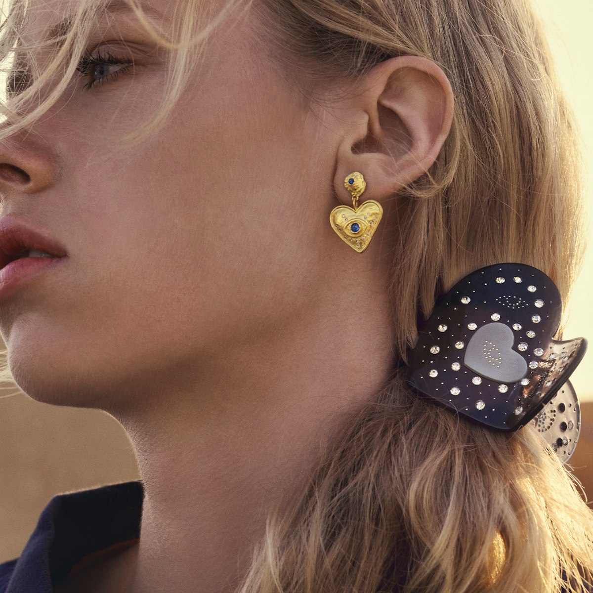 I midten af de kærlighedsfyldte Constantine Earrings blinker den blå kyanit, der på græsk kan oversættes til ’mørkeblå’, og som siges at være en afstressende, healende, beroligende sten. Et smykkepar af ren kærlighed og ro.