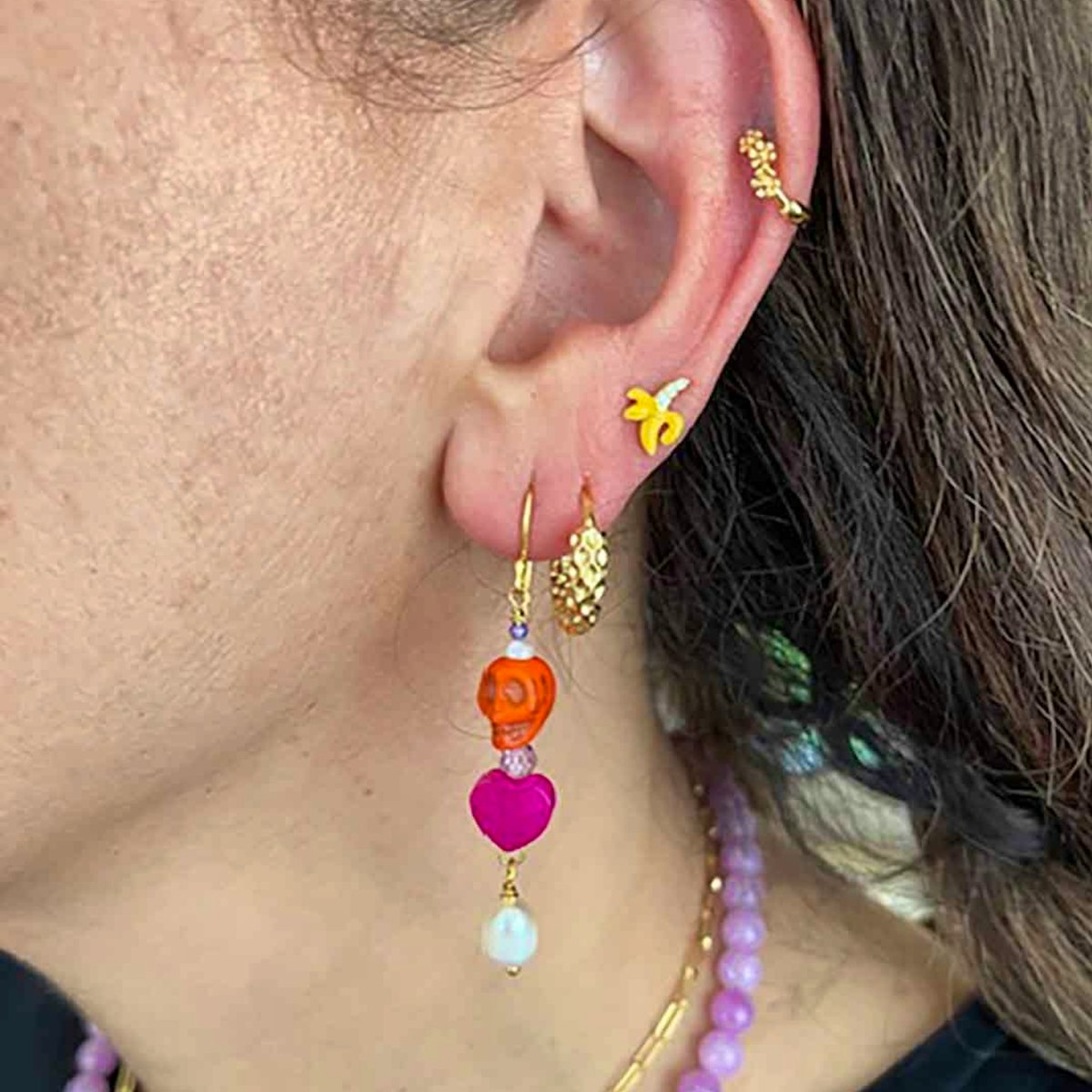 The design is anything but ordinary. You get a fun mix of colored ceramic skulls, small flowers and heart-shaped stones. And of course, freshwater pearls and crystals add a touch of elegance to the otherwise playful look. The shape of the two earrings is not identical, and that's what makes them so exciting. They match without being the same, giving a personal touch that stands out.